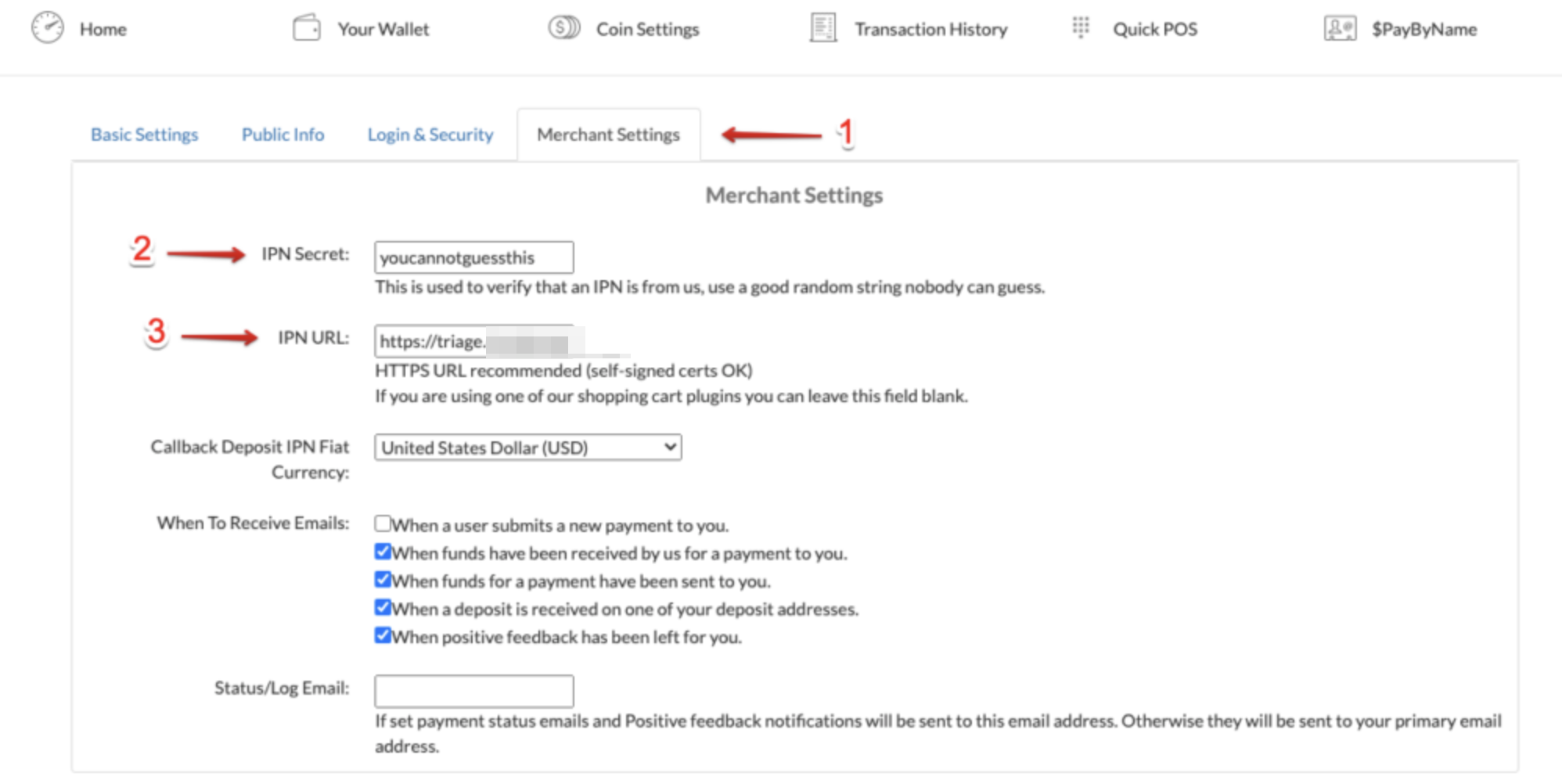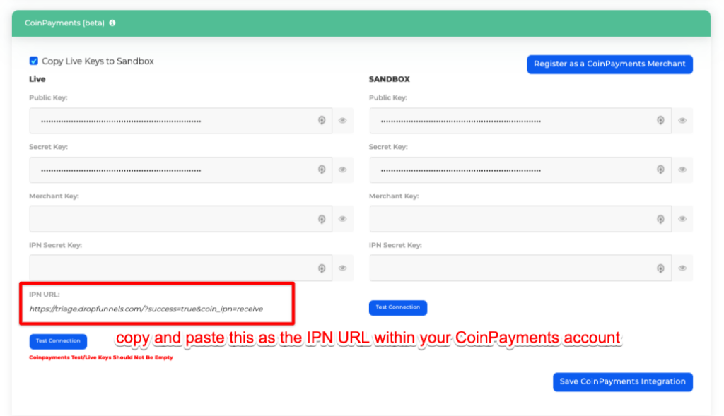 For the IPN URL, copy the link provided inside your COA account and paste it inside the IPN URL field inside your CoinPayments account