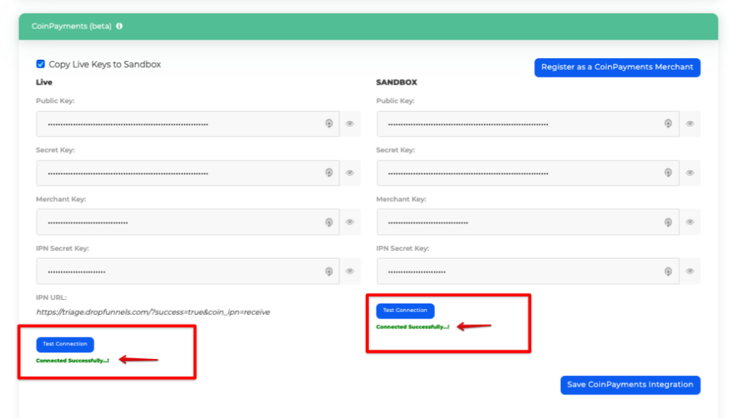 Click the Test Connection button inside your COA account CoinPayments integration and it should be connected successfully.