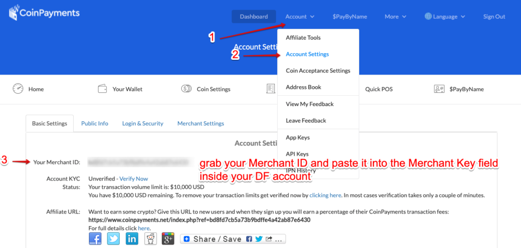 Copy that Merchant ID and paste it into the Merchant Key field inside your COA account.