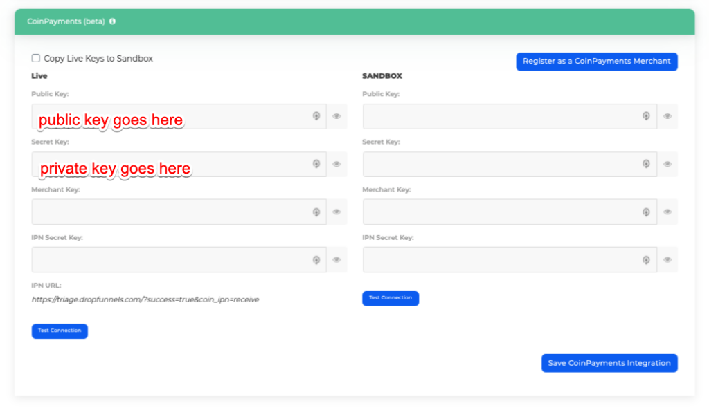 NOTE: Remember to click Update Account (inside CoinPayments), only then to Save CoinPayments Integration inside DF.
