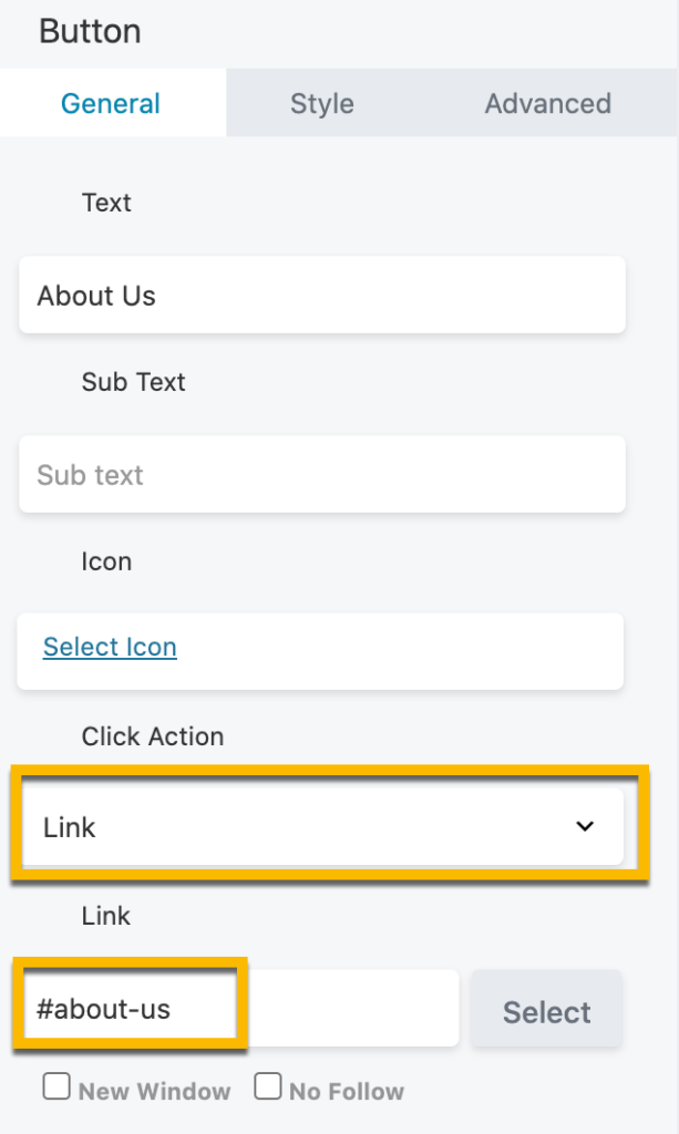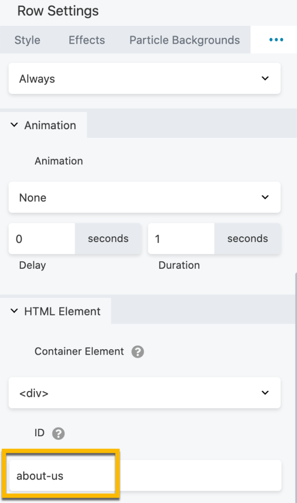 Step 6: In the Element Settings, navigate to the Advanced tab, scroll down to the HTML Elements ID and enter the exact name you used in step 2, without the '#'.