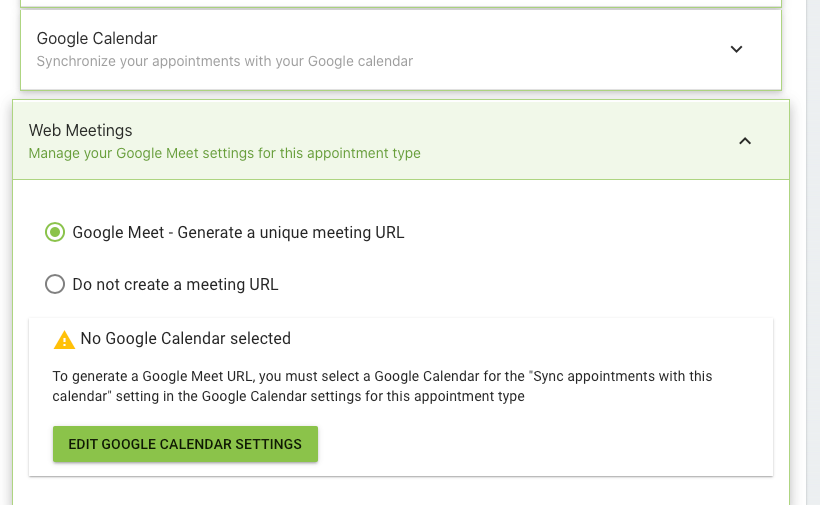 After selecting a calendar to sync appointments with, you can safely enable the Web Meetings option. Just select Google Meet – Generate a unique meeting URL.